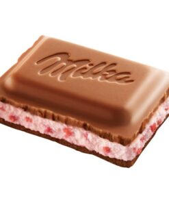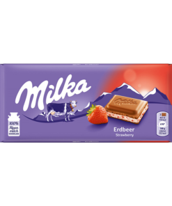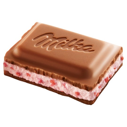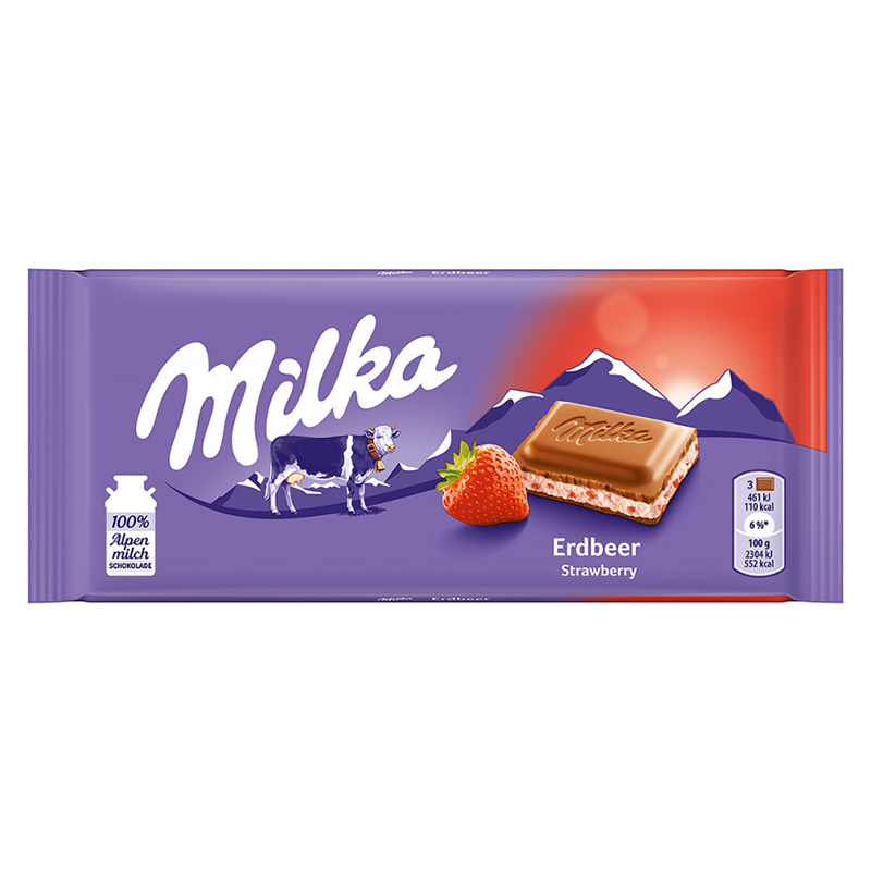 Alpesi tejcsokoládé epres-joghurtos ízű krémmel töltve.