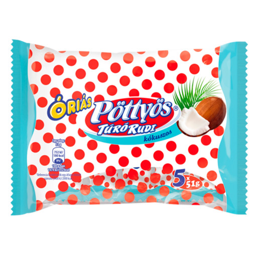 Pöttyös Giant Cottage Cheese Dessert with Coconut and Milk Coating (Óriás Túró Rudi KÓKUSZOS túródesszert tejes bevonattal) 5 x 51 g (255 g) – exp 27/12