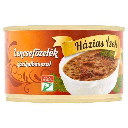 Ivóvíz, Házikolbász 14% (sertéshús, ipari szalonna, étkezési só, csemege őrölt paprika, fűszerek, tartósítószer: nátrium-nitrit), Étkezési lencse 13%, Búzaliszt, Napraforgó étolaj, Tejföl, Fűszerek, Ételízesítő, Étkezési só, Mustár (ivóvíz, mustármag, ételecet, cukor, étkezési só, fűszerek, aroma), Füstaroma, Cukor, Ecet