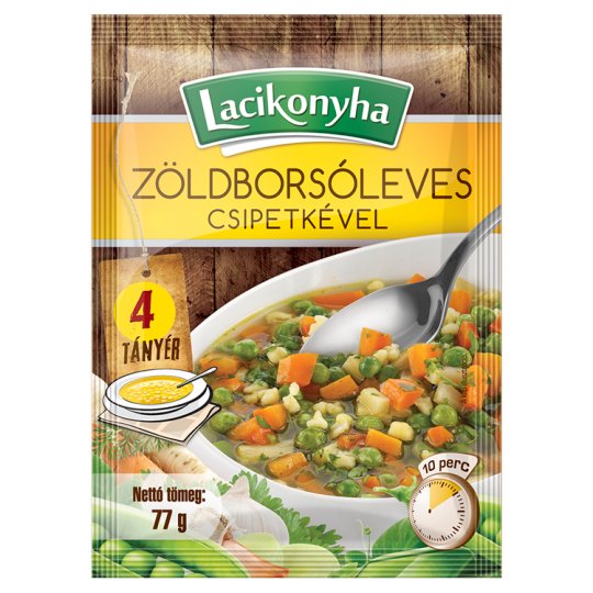 Csipetketészta 45,4% (búzaliszt, tyúktojás, víz), Szárított zöldségek (32): zöldborsó 26%, paszternák, sárgarépa, petrezselyem, vöröshagyma, fokhagyma, póréhagyma, Étkezési só, Maltodextrin, Ízfokozók: nátrium-glutamát, dinátrium-5′-ribonukleotidok, Hidrolizált növényi fehérje, Csirkezsír, Feketebors, Aroma (zellert tartalmaz), Színezék: ammóniás karamell