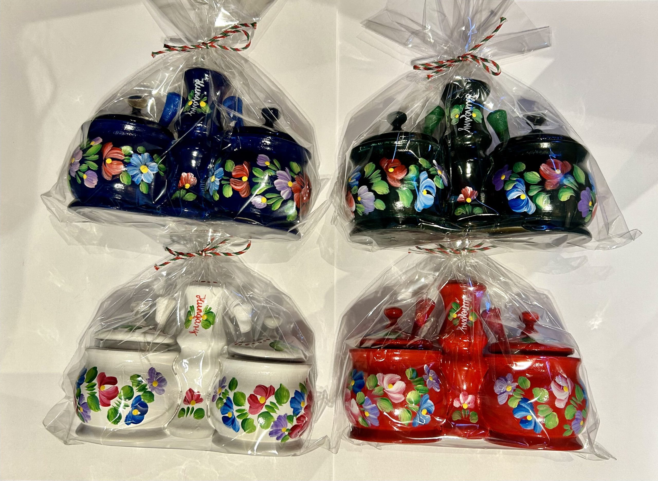 Salt and pepper holder package (wooden, hand-painted) Só és borstartó csomag – includes 2 small spoons, random colors